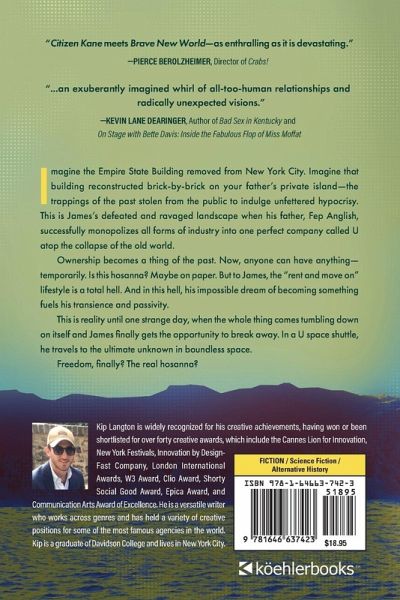 Imagine the Empire State Building removed from New York City. Imagine that building reconstructed brick-by-brick on your father's private island-the trappings of the past stolen from the public to indulge unfettered hypocrisy. This is James's defeated and ravaged landscape when his father, Fep Anglish, successfully monopolizes all forms of industry into one perfect company called U atop the collapse of the old world. Ownership becomes a thing of the past. Now, anyone can have anything-temporarily. Is this hosanna? Maybe on paper. But to James, the "rent and move on" lifestyle is a total hell. And in this hell, his impossible dream of becoming something fuels his transience and passivity. This is reality until one strange day, when the whole thing comes tumbling down on itself and James finally gets the opportunity to break away. In a U space shuttle, he travels to the ultimate unknown in boundless space. Freedom, finally? The real hosanna?