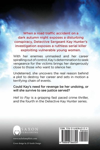 When a road traffic accident on a dark autumn night uncovers a disturbing conspiracy, Detective Sergeant Kay Hunter's investigation exposes a ruthless serial killer exploiting vulnerable young women. With her enemies unmasked and her career spiralling out of control, Kay's determination to seek vengeance for the victims brings her dangerously close to those who want to silence her. Undeterred, she uncovers the real reason behind a plot to destroy her career and sets in motion a terrifying chain of events. Could Kay's need for revenge be her undoing, or will she survive to see justice served? Hell to Pay is a gripping fast paced crime thriller, and the fourth in the Detective Kay Hunter series.