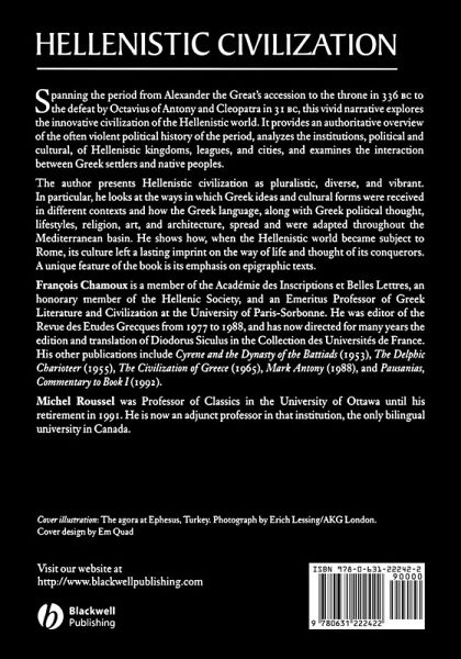 List of Plates. List of Figures. List of Maps. Forword to the 1981 Edition. Forword to the 2002 English translation. Introduction. 1. Alexander: A Universal Monarchy. 2. The Diadochi: The Dream of Unity. 3. The Hellenistic Monarchies: Their Years of Glory. 4. The East Torn Apart, Then Conquered. 5. The Agony of the Hellenistic World. 6. The Survival of the City. 7. The Monarchical System. 8. The Hellenistic Lifestyle. 9. The Needs of the Soul. 10. The Life of the Spirit and the Flowering of Art. Conclusion. Lexicon of Terms. Chronological Tables. Bibliography and Suggestions for Further Reading. Index.