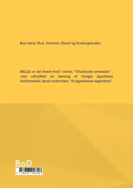 HELLIG er det femte bind i serien: "Ufuldendte serenader" - som udtrykker en læsning af Giorgio Agambens forfatterskab; deraf undertitlen: "Et Agambensk nøgenbind".