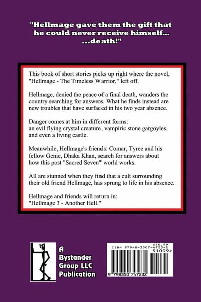 This book of short stories picks up right where the novel, "Hellmage-The Timeless Warrior," left off. Hellmage, denied the peace of a final death, wanders the country searching for answers. What he finds instead are new troubles that have surfaced in his two year absence. Dangers come in different forms: an evil flying crystal creature, vampiric stone gargoyles, and even a living castle. Meanwhile, Hellmage's friends, Comar, Tyree and his fellow Genie, Dhaka Khan, search for answers about how this post "Sacred Seven" world works. All are stunned when they find that the cult surrounding their old friend Hellmage, has sprung into life in his absence. Hellmage and friends will return in: "Hellmage 3-Another Hell."