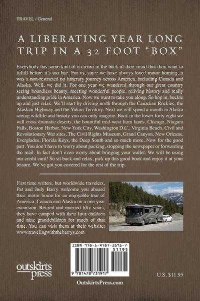 A LIBERATING YEAR LONG TRIP IN A 32 FOOT "BOX" ... Everybody has some kind of a dream in the back of their mind that they want to fulfill before it's too late. For us, since we have always loved motor homing, it was a non-restricted no itinerary journey across America, including Canada and Alaska. Well, we did it. For one year we wandered through our great country seeing boundless beauty, meeting wonderful people, reliving history and really understanding pride in America. Now we want to take you along. So hop in, buckle up and just relax. We'll start by driving north through the Canadian Rockies, the Alaskan Highway and the Yukon Territory. Next we will spend a month in Alaska seeing wildlife and beauty you can only imagine. Back in the lower forty eight we will cross dramatic deserts, the bountiful mid-west farm lands, Chicago, Niagara Falls, Boston Harbor, New York City, Washington D.C., Virginia Beach, Civil and Revolutionary War sites, The Civil Rights Museum, Grand Canyon, New Orleans, Everglades, Florida Keys, the Deep South and so much more. Now for the good part. You don't have to worry about packing, stopping the newspaper or forwarding the mail. In fact don't even worry about bringing your wallet. We will be using our credit card! So sit back and relax, pick up this good book and enjoy it at your leisure. We've got you covered for the rest of the trip.