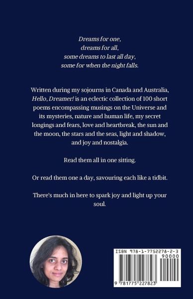 Dreams for one, dreams for all, some dreams to last all day, some for when the night falls. Written during my sojourns in Canada and Australia, Hello, Dreamer! is an eclectic collection of 100 short poems encompassing musings on the Universe and its mysteries, nature and human life, my secret longings and fears, love and heartbreak, the sun and the moon, the stars and the seas, light and shadow, and joy and nostalgia. Read them all in one sitting. Or read them one a day, savouring each like a tidbit. There's much in here to spark joy and light up your soul.