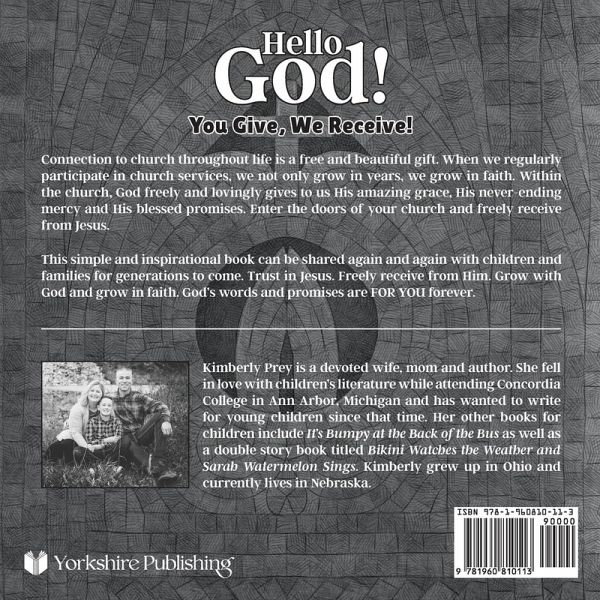 Kimberly Prey's third title, shows the reader how being connected to a church family throughout life is a free and beautiful gift. When we regularly participate in church services, we not only grow in years, we grow in faith. Within the church, God freely and lovingly gives to us His amazing grace, His never-ending mercy and His blessed promises. Enter the doors of your church and freely receive from Jesus. This simple and inspirational book can be shared again and again with children and families for generations to come. Trust in Jesus. Freely receive from Him. Grow with God and grow in faith. God's words and promises are FOR YOU forever.