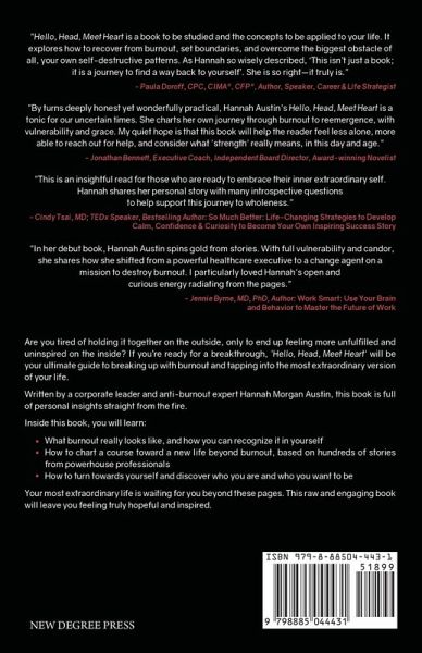 "I devoured this book. My very favorite phrase in the book (and one that I have adopted in my own head now), is 'self-care isn't going to fix this." -Laura H. "This was one of the most honest, raw books I've read in the last 5 years. The exercises in the book were so thought-provoking. Each one made me think about HOW I want to live my life and WHAT the next steps are to reach the life I WANT. Finally, a self-help book that actually HELPS!" - Susan B. Are you tired of holding it together on the outside, only to end up feeling more unfulfilled and uninspired on the inside? If you're ready for a breakthrough, 'Hello, Head, Meet Heart' will be your ultimate guide to breaking up with burnout and tapping into the most extraordinary version of your life. Written by a corporate leader and anti-burnout expert Hannah Morgan Austin, this book is full of personal insights straight from the fire. Inside this book, you will learn: What burnout really looks like, and how you can recognize it in yourself. How to chart a course toward a new life beyond burnout, based on hundreds of stories from powerhouse professionals. How to turn towards yourself and discover who you are and who you want to be Your most extraordinary life is waiting for you beyond these pages. This raw and engaging book will leave you feeling truly hopeful and inspired.