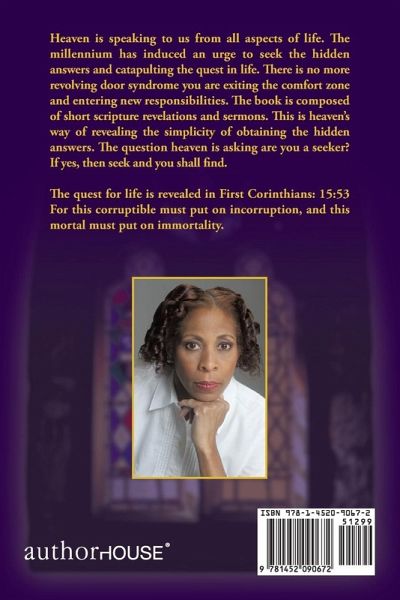 Heaven is speaking to us from all aspects of life. The millennium has induced an urge to seek the hidden answers and catapulting the quest in life. There is no more revolving door syndrome you are exiting the comfort zone and entering new responsibilities. The book is composed of short scripture revelations and sermons. This is heaven's way of revealing the simplicity of obtaining the hidden answers. The question heaven is asking are you a seeker? If yes, then seek and you shall find. The quest for life is revealed in First Corinthians: 15:53 For this corruptible must put on incorruption, and this mortal must put on immortality.