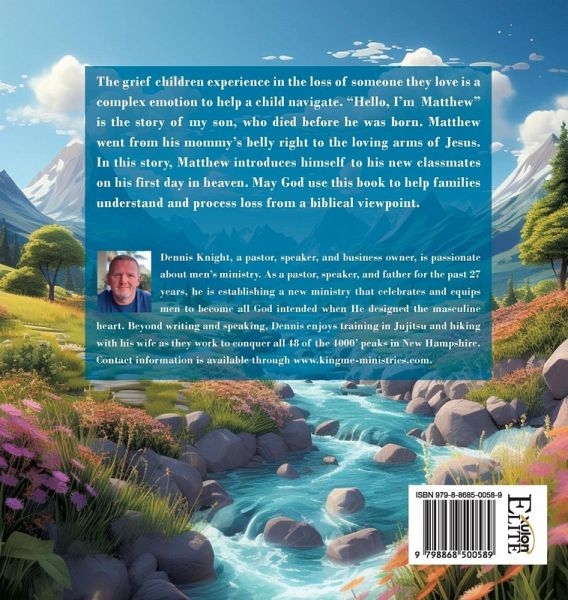 The grief children experience in the loss of someone they love is a complex emotion to help a child navigate. "Hello, I'm Matthew" is the story of my son, who died before he was born. Matthew went from his mommy's belly right to the loving arms of Jesus. In this story, Matthew introduces himself to his new classmates on his first day in heaven. May God use this book to help families understand and process loss from a biblical viewpoint. Dennis Knight, a pastor, speaker, and business owner, is passionate about men's ministry. As a pastor, speaker, and father for the past 27 years, he is establishing a new ministry that celebrates and equips men to become all God intended when He designed the masculine heart. Beyond writing and speaking, Dennis enjoys training in Jujitsu and hiking with his wife as they work to conquer all 48 of the 4000' peaks in New Hampshire. Contact information is available through www.kingme-ministries.com.