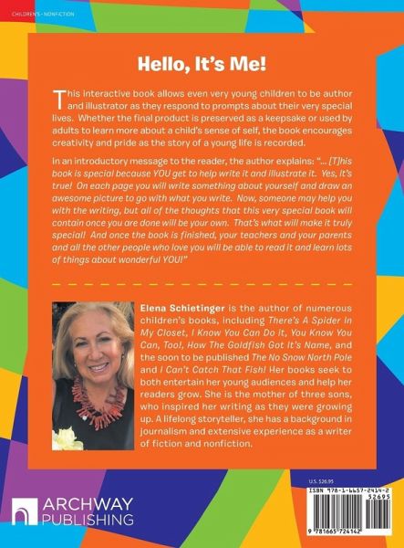 This interactive book allows even very young children to be author and illustrator as they respond to prompts about their very special lives. Whether the final product is preserved as a keepsake or used by adults to learn more about a child's sense of self, the book encourages creativity and pride as the story of a young life is recorded. In an introductory message to the reader, the author explains: "... [T]his book is special because YOU get to help write it and illustrate it. Yes, it's true! On each page you will write something about yourself and draw an awesome picture to go with what you write. Now, someone may help you with the writing, but all of the thoughts that this very special book will contain once you are done will be your own. That's what will make it truly special! And once the book is finished, your teachers and your parents and all the other people who love you will be able to read it and learn lots of things about wonderful YOU!"