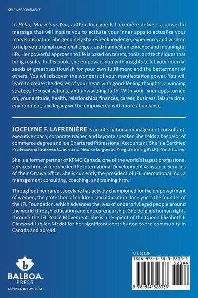 In Hello, Marvelous You, author Jocelyne F. Lafrenire delivers a powerful message that will inspire you to activate your inner apps to actualize your marvelous nature. She genuinely shares her knowledge, experience, and wisdom to help you triumph over challenges, and manifest an enriched and meaningful life. Her powerful approach to life is based on tenets, tools, and techniques that bring results. In this book, she empowers you with insights to let your internal seeds of greatness flourish for your own fulfillment and the betterment of others. You will discover the wonders of your manifestation power. You will learn to create the desires of your heart with good-feeling thoughts, a winning strategy, focused actions, and unwavering faith. With your inner apps turned on, your attitude, health, relationships, finances, career, business, leisure time, environment, and legacy will be empowered with more abundance.