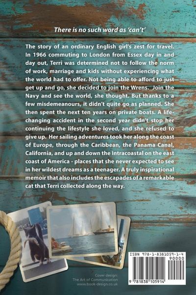 There is no such word as 'can't' The story of an ordinary English girl's zest for travel. In 1966 commuting to London from Essex day in and day out, Terri was determined not to follow the norm of work, marriage and kids without experiencing what the world had to offer. Not being able to afford to just get up and go, she decided to join the Wrens. Join the Navy and see the world, she thought. But thanks to a few misdemeanours, it didn't quite go as planned. She then spent the next ten years on private boats. A life-changing accident in the second year didn't stop her continuing the lifestyle she loved, and she refused to give up. Her sailing adventures took her along the coast of Europe, through the Caribbean, the Panama Canal, California, and up and down the Intracoastal on the east coast of America - places that she never expected to see in her wildest dreams as a teenager. A truly inspirational memoir that also includes the escapades of a remarkable cat that Terri collected along the way.
