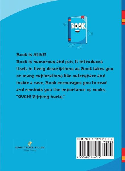 Book is ALIVE! Book is humorous and fun. It introduces itself in lively descriptions as Book takes you on many explorations like outerspace and inside a cave. Book encourages you to read and reminds you the importance of books. "OUCH! Ripping hurts." ¿