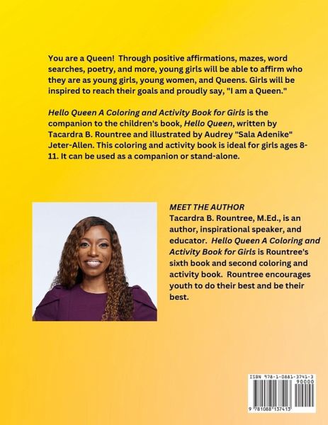 You are a Queen! Through positive affirmations, mazes, word searches, poetry, and more, young girls will be able to affirm who they are as young girls, young women, and Queens. Girls will be inspired to reach their goals and proudly say, "I am a Queen." Hello Queen A Coloring and Activity Book for Girls is the companion to the children's book, Hello Queen, written by Tacardra B. Rountree and illustrated by Audrey "Sala Adenike" Jeter-Allen. This coloring and activity book is ideal for girls ages 8-11. It can be used as a companion or stand-alone.