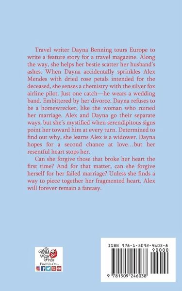 Travel writer Dayna Benning tours Europe to write a feature story for a travel magazine. Along the way, she helps her bestie scatter her husband's ashes. When Dayna accidentally sprinkles Alex Mendes with dried rose petals intended for the deceased, she senses a chemistry with the silver fox airline pilot. Just one catch-he wears a wedding band. Embittered by her divorce, Dayna refuses to be a homewrecker, like the woman who ruined her marriage. Alex and Dayna go their separate ways, but she's mystified when serendipitous signs point her toward him at every turn. Determined to find out why, she learns Alex is a widower. Dayna hopes for a second chance at love...but her resentful heart stops her. Can she forgive those that broke her heart the first time? And for that matter, can she forgive herself for her failed marriage? Unless she finds a way to piece together her fragmented heart, Alex will forever remain a fantasy.