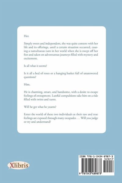 Her. Simply sweet and independent, she was quite content with her life and its offerings, until a certain situation occurred, causing a tumultuous turn in her world when she is swept off her feet and taken on adventurous journeys filled with mystery and excitement. Is all what it seems? Is it all a bed of roses or a hanging basket full of unanswered questions? Him. He is charming, smart, and handsome, with a desire to escape feelings of entrapment. Lustful compulsions take him on a ride filled with twists and turns. Will he get what he yearns? Enter the world of these two individuals as their raw and true feelings are exposed through many escapades . . . Will you judge or try and understand?