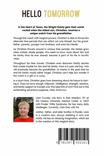 In the heart of Texas, the Wright family gets their world rocked when the oldest son, Christian, receives a unique watch from his grandfather. Through this watch with magical powers, Christian is able to thrust into alternate time periods that can affect not only himself, but his grandfather, parents, younger twin brothers, and even his friends. As Christian thrusts around in various time periods, the stakes grow when wicked, shady people, who seem to know more about him and his family than he ever shared, become a part of his life in horrific ways. Throughout his time travels, Christian even discovers family secrets that create trouble for him and his family. From a 5-year-old boy, who will eventually become his grandfather, to events in the past that he and his family would rather forget, Christian can't help but wonder if the watch is a gift or a curse. In a short time, Christian goes from dreaming about his future to fearing it. Does he have enough willpower, intelligence, strength, stamina, and family support to triumph over this labyrinth of evil? Find out in the exhilarating adventure-suspense, Hello Tomorrow.