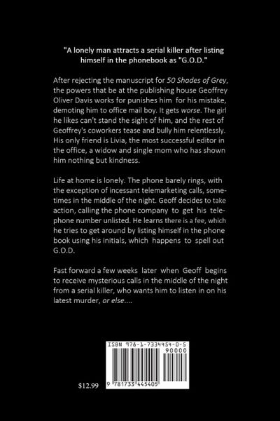 A lonely man attracts a serial killer after listing himself in the phone book as G.O.D. After rejecting the manuscript for The Da Vinci Code, the powers that be at the publishing house Geoffrey Oliver Davis works for punishes him for his mistake, demoting him to office mail boy. It gets worse. The girl he likes can't stand the sight of him, and the rest of Geoffrey's coworkers tease and bully him relentlessly. His only friend is Livia, the most successful editor in the office, a widow and single mom who has shown him nothing but kindness. Life at home is lonely. The phone barely rings, with the exception of incessant telemarketing calls, sometimes in the middle of the night. Geoff decides to take action, calling the phone company to get his telephone number unlisted. He learns there is a fee, which he tries to get around by listing himself in the phone book using his initials, which happens to spell out G.O.D. Fast forward a few weeks later when Geoff begins to receive mysterious calls in the middle of the night from a serial killer, who wants him to listen in on his latest murder, or else.... (A Screenplay)