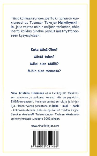 Tämä pieni kolmeen runoon jaettu kirjanen on sekä nuorille että aikuisille suunnattu kunnianosoitus Tuomaan Tekojen Helmihymnille, joka vastaa näihin neljään tärkeään, ehkä meitä kaikkia ainakin joskus mietityttäneeseen kysymykseen: Kuka minä olen, mistä tulen, miksi olen täällä ja mihin olen menossa? Kirjan alkupuoli on kirjoitettu kysymysten ja loppupuoli vastausten muotoon.