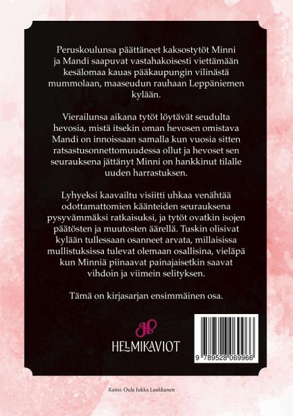 Peruskoulunsa päättäneet kaksostytöt Minni ja Mandi saapuvat vastahakoisesti viettämään kesälomaa kauas pääkaupungin vilinästä mummolaan, maaseudun rauhaan Leppäniemen kylään. Vierailunsa aikana tytöt löytävät seudulta hevosia, mistä itsekin oman hevosen omistava Mandi on innoissaan samalla kun vuosia sitten ratsastusonnettomuudessa ollut ja hevoset sen seurauksena jättänyt Minni on hankkinut tilalle uuden harrastuksen. Lyhyeksi kaavailtu visiitti uhkaa venähtää odottamattomien käänteiden seurauksena pysyvämmäksi ratkaisuksi, ja tytöt ovatkin isojen päätösten ja muutosten äärellä. Tuskin olisivat kylään tullessaan osanneet arvata, millaisissa mullistuksissa tulevat olemaan osallisina, vieläpä kun Minniä piinaavat painajaisetkin saavat vihdoin ja viimein selityksen. Tämä on Helmikaviot-kirjasarjan ensimmäinen osa.