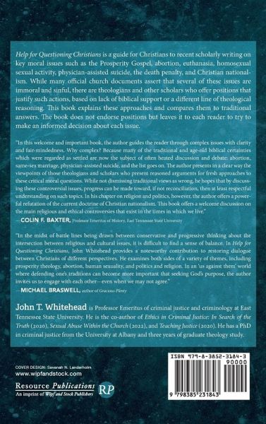 Help for Questioning Christians by John Whitehead is a guide for Christians to recent scholarly writing on key moral issues such as the Prosperity Gospel, abortion, euthanasia, homosexual sexual activity, physician-assisted suicide, the death penalty, and Christian nationalism. While many official church documents assert that several of these issues are immoral and sinful, there are theologians and other scholars who offer positions that justify such actions, based on lack of biblical support or a different line of theological reasoning. This book explains these approaches and compares them to traditional answers. The book does not endorse positions but leaves it to each reader to try to make an informed decision about each issue.