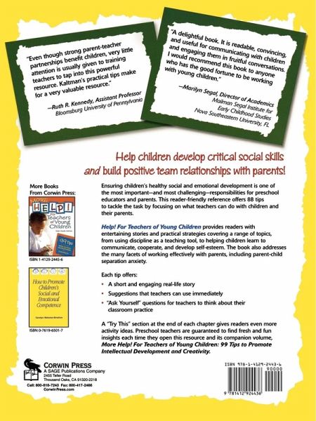"A delightful book. . . . It is readable, convincing, and useful for communicating with children and engaging them in fruitful conversations. I would recommend this book to anyone who has the good fortune to be working with young children." -Marilyn Segal, Director of Academics Mailman Segal Institute for Early Childhood Studies Nova Southeastern University, FL "Even though strong parent-teacher partnerships benefit children, very little attention is usually given to training teachers to tap into this powerful resource. Kaltman¿s practical tips make for a very valuable resource." -Ruth R. Kennedy, Assistant Professor Bloomsburg University of Pennsylvania Help children develop critical social skills and build positive team relationships with parents! Ensuring children¿s healthy social and emotional development is one of the most important-and most challenging-responsibilities for preschool educators and parents. This reader-friendly reference offers 88 tips to tackle the task by focusing on what teachers can do with children and their parents. Help! For Teachers of Young Children provides readers with entertaining stories and practical strategies covering a range of topics, from using discipline as a teaching tool, to helping children learn to communicate, cooperate, and develop self-esteem. The book also addresses the many facets of working effectively with parents, including parent-child separation anxiety. Each tip offers: * A short and engaging real-life story * Suggestions that teachers can use immediately * "Ask Yourself" questions for teachers to think about their classroom practice A "Try This" section at the end of each chapter gives readers even more activity ideas. Preschool teachers are guaranteed to find fresh and fun insights each time they open this resource and its companion volume, More Help! For Teachers of Young Children: 99 Tips to Promote Intellectual Development and Creativity.