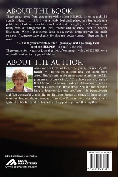 These essays come from encounters with a silent HELPER, whom as a child, I couldn't identify. In 1953, I was a nearly deaf child placed in first grade in a public school where I sank like a rock and sank for eight years. At home, I was living with an un-diagnosed Bipolar mother, and in school, sent to Special Education. When I encountered Jesus at age seven, strong answers that made sense, as if someone were silently helping me, began coming. Then, one day, I read: "....it is to your advantage that I go away, for if I go away, I will send the HELPER to you." John 16:7 These essays from years of journal entries are from encounters with the HELPER and were originally written for my grandchildren.