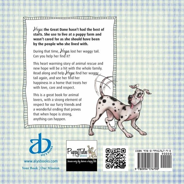 Hope the Great Dane hasn't had the best of starts. She use to live at a puppy farm and wasn't cared for as she should have been by the people who she lived with. During that time, Hope lost her waggy tail. Can you help her find it? This heart warming story of animal rescue and new hope will be a hit with the whole family. Read along and help Hope find her waggy tail again, and see her find her happiness in a home that treats her with love, care and respect. This is a great book for animal lovers, with a strong element of respect for our furry friends and a wonderful ending that proves that when hope is strong, anything can happen.