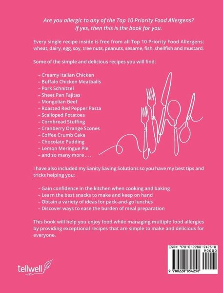 Are you allergic to any of the Top 10 Priority Food Allergens? If yes, then this is the book for you. Every single recipe inside is free from all Top 10 Priority Food Allergens: wheat, dairy, egg, soy, tree nuts, peanuts, sesame, fish, shellfish and mustard. Some of the simple and delicious recipes you will find: - Creamy Italian Chicken - Buffalo Chicken Meatballs - Pork Schnitzel - Sheet Pan Fajitas - Mongolian Beef - Roasted Red Pepper Pasta - Scalloped Potatoes - Cornbread Stuffing - Cranberry Orange Scones - Coffee Crumb Cake - Chocolate Pudding - Lemon Meringue Pie - and so many more . . . I have also included my Sanity Saving Solutions so you have my best tips and tricks helping you: - Gain confidence in the kitchen when cooking and baking - Learn the best snacks to make and keep on hand - Obtain a variety of ideas for pack-and-go lunches - Discover ways to ease the burden of meal preparation This book will help you enjoy food while managing multiple food allergies by providing exceptional recipes that are simple to make and delicious for everyone.