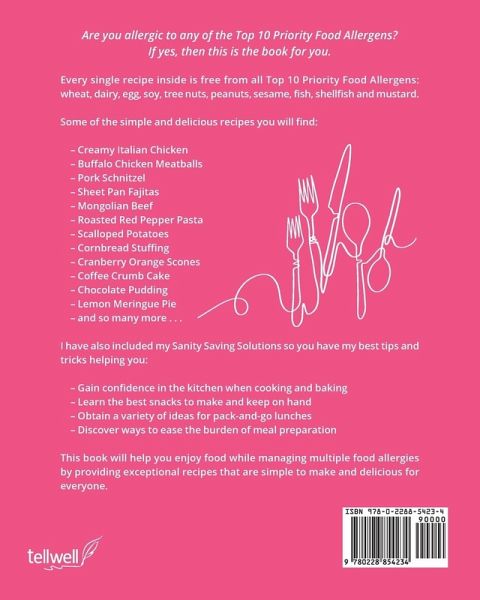 Are you allergic to any of the Top 10 Priority Food Allergens? If yes, then this is the book for you. Every single recipe inside is free from all Top 10 Priority Food Allergens: wheat, dairy, egg, soy, tree nuts, peanuts, sesame, fish, shellfish and mustard. Some of the simple and delicious recipes you will find: - Creamy Italian Chicken - Buffalo Chicken Meatballs - Pork Schnitzel - Sheet Pan Fajitas - Mongolian Beef - Roasted Red Pepper Pasta - Scalloped Potatoes - Cornbread Stuffing - Cranberry Orange Scones - Coffee Crumb Cake - Chocolate Pudding - Lemon Meringue Pie - and so many more . . . I have also included my Sanity Saving Solutions so you have my best tips and tricks helping you: - Gain confidence in the kitchen when cooking and baking - Learn the best snacks to make and keep on hand - Obtain a variety of ideas for pack-and-go lunches - Discover ways to ease the burden of meal preparation This book will help you enjoy food while managing multiple food allergies by providing exceptional recipes that are simple to make and delicious for everyone.