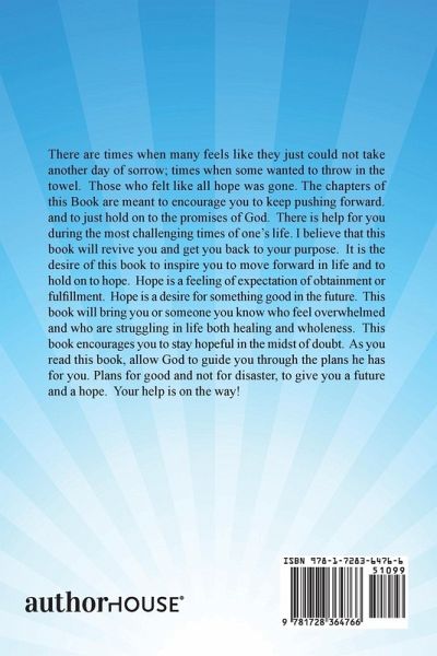 There are times when many feels like they just could not take another day of sorrow; times when some wanted to throw in the towel. Those who felt like all hope was gone. The chapters of this Book are meant to encourage you to keep pushing forward. and to just hold on to the promises of God. There is help for you during the most challenging times of one's life. I believe that this book will revive you and get you back to your purpose. It is the desire of this book to inspire you to move forward in life and to hold on to hope. Hope is a feeling of expectation of obtainment or fulfillment. Hope is a desire for something good in the future. This book will bring you or someone you know who feel overwhelmed and who are struggling in life both healing and wholeness. This book encourages you to stay hopeful in the midst of doubt. As you read this book, allow God to guide you through the plans he has for you. Plans for good and not for disaster, to give you a future and a hope. Your help is on the way!