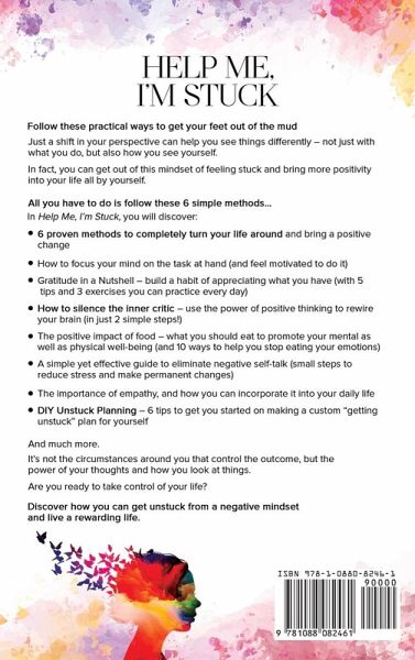 Follow these practical ways to get your feet out of the mud Are you dispirited and unfocused? Do you catch yourself being too harsh of a critic on your own actions? Do you want to change how you think about yourself but feel lost? If you found the above questions relatable, then there's a good chance you're stuck in a self-sabotaging mindset - one that revolves around negative thoughts that limit you from growing. According to the National Science Foundation, an average person has around 12,000 to 60,000 thoughts per day, most in the form of self-talk, of which 80% are negative and 95% are repetitive. While this self-talk is completely natural, its negative aspect fails to promote your overall well-being, whether physical or mental. These negative thoughts can lead to feeling unmotivated to take action, because you don't see your self-worth, which can increase the feeling of being stuck. As a result, you'll often feel helpless, causing a drop in motivation and a heavy hit to your health - you'll end up becoming your own worst enemy. But life doesn't have to be this complicated. Just a shift in your perspective can help you see things differently - not just with what you do, but also how you see yourself. In fact, you can get out of this mindset of feeling stuck and bring more positivity into your life all by yourself. All you have to do is follow these 6 simple methods... In Help Me, I'm Stuck, you will discover:6 proven methods to completely turn your life around and bring a positive change How to focus your mind on the task at hand (and feel motivated to do it) Gratitude in a Nutshell - build a habit of appreciating what you have (with 5 tips and 3 exercises you can practice every day) How to silence the inner critic - use the power of positive thinking to rewire your brain (in just 2 simple steps!) The positive impact of food - what you should eat to promote your mental as well as physical well-being (and 10 ways to help you stop eating your emotions) A simple yet effective guide to eliminate negative self-talk (small steps to reduce stress and make permanent changes) The importance of empathy, and how you can incorporate it into your daily life DIY Unstuck Planning - 6 tips to get you started on making a custom "getting unstuck" plan for yourself And much more. While it may seem so, it's not the circumstances around you that control the outcome, but the power of your thoughts and how you look at things. Are you ready to take control of your life? If you want to get unstuck from a negative mindset and live a rewarding life, then scroll up and click "Add to Cart" right now.