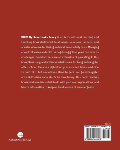 TRT Help! My Nana Looks Funny is an informational learning and teaching book dedicated to all nanas, memaws, lao laos, and abuelas who care for their grandchildren on a daily basis. Managing chronic illnesses and children rearing during golden years can have its challenges. Grandmothers are an extension of parenting. In this book, Nana is a grandmother who helps care for her granddaughter after school. Nana has high blood pressure and takes medicine to control it, but sometimes, Nana forgets. Her granddaughter acts Fast when Nana starts to look funny. This book teaches household members what to do with pictures, explanations, and health information to keep on hand in case of an emergency.