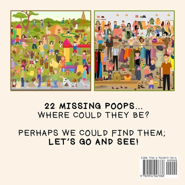 22 missing poops, where could they be? Perhaps we could find them? Let's go and see! In this fun, spot the poop puzzle game, you'll travel through a park, a clothes store, a farm, a building site, and many more places in the search for those some naughty poops you've escaped the toilet. See if you can find Poogan, Stinkles, Poozanne and even Mr Pooping along the way! A great novelty book for 2-5 year olds. For the kids who like Where's Wally/Waldo books but find the puzzles a little tricky.