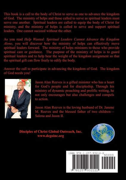 "Help Wanted: Spiritual Leaders Cannot Advance the Kingdom Alone" is a call to the body of Christ to serve as one to advance the kingdom of God. The ministry of helps and those called to serve as spiritual leaders must serve one another. Spiritual leaders are called to equipt the body of Christ for ministry, and the ministry of helps is called to serve and support spiritual leaders. One cannot succed without the other. Regardless of your function in the body, answer the call to participate in advancing the kingdom of God through serving one another.