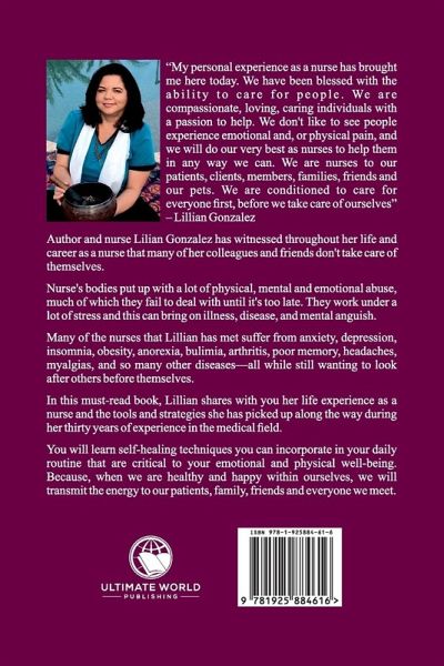 "My personal experience as a nurse has brought me here today. We have been blessed with the ability to care for people. We are compassionate, loving, caring individuals with a passion to help. We don’t like to see people experience emotional and, or physical pain, and we will do our very best as nurses to help them in any way we can. We are nurses to our patients, clients, members, families, friends and our pets. We are conditioned to care for everyone first, before we take care of ourselves" – Lillian Gonzalez. Author and nurse Lilian Gonzalez has witnessed throughout her life and career as a nurse that many of her colleagues and friends don’t take care of themselves. Nurse’s bodies put up with a lot of physical, mental and emotional abuse, much of which they fail to deal with until it’s too late. They work under a lot of stress and this can bring on illness, disease, and mental anguish. Many of the nurses that Lillian has met suffer from anxiety, depression, insomnia, obesity, anorexia, bulimia, arthritis, poor memory, headaches, myalgias, and so many other diseases—all while still wanting to look after others before themselves. In this must-read book, Lillian shares with you her life experience as a nurse and the tools and strategies she has picked up along the way during her thirty years of experience in the medical field. You will learn self-healing techniques you can incorporate in your daily routine that are critical to your emotional and physical wellbeing. Because, when we are healthy and happy within ourselves, we will transmit the energy to our patients, family, friends and everyone we meet.