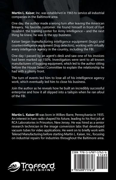 Martin L. Kaiser, Inc. was established in 1965 to service all industrial companies in the Baltimore area. One day, the author made a wrong turn after leaving the American Brewery, his favorite customer. He found himself in front of Fort Holabird, the training center for Army intelligence - and the next thing he knew, he was in the spy business. Kaiser began manufacturing intelligence equipment (bugs) and counterintelligence equipment (bug detectors), working with virtually every intelligence agency in the country, including the FBI. One day I passed by an agent's desk and saw one of his invoices had been marked up 150%. Investigators were sent to all known manufacturers of bugging equipment, which led to the author sitting before the House Select Committee to explain the relationship he had with a phony front. The turn of events led him to lose all of his intelligence agency work, which eventually led him to close his business. Join the author as he reveals how he built an incredibly successful enterprise and how it all slipped into a tailspin when he ran afoul of the FBI.