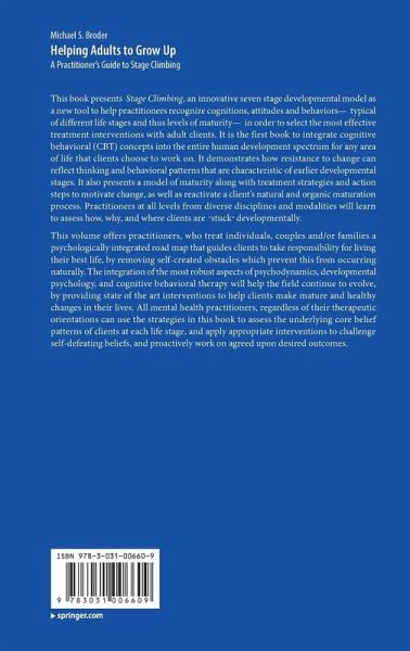 This book presents Stage Climbing, an innovative seven stage developmental model as a new tool to help practitioners recognize cognitions, attitudes and behaviors-- typical of different life stages and thus levels of maturity-- in order to select the most effective treatment interventions with adult clients. It is the first book to integrate cognitive behavioral (CBT) concepts into the entire human development spectrum for any area of life that clients choose to work on. It demonstrates how resistance to change can reflect thinking and behavioral patterns that are characteristic of earlier developmental stages. It also presents a model of maturity along with treatment strategies and action steps to motivate change, as well as reactivate a client's natural and organic maturation process. Practitioners at all levels from diverse disciplines and modalities will learn to assess how, why, and where clients are "stuck" developmentally.