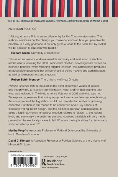 Helping America Vote is focused on the conflict between values of access and integrity in U.S. election administration. Kropf and Kimball examine both what was included in HAVA and what was not. Widespread agreement that voting equipment was a problem made technology the centerpiece of the legislation, and it has remedied a number of pressing concerns. But there is still reason to be concerned about key aspects of electronic voting, ballot design, and the politics of partisan administrators. It takes a legitimacy crisis for serious election reforms to happen at the federal level, and seemingly, the crisis has passed. However, the risk is still very much present for the electoral process to fail. What are the implications for democracy when we attempt reform?
