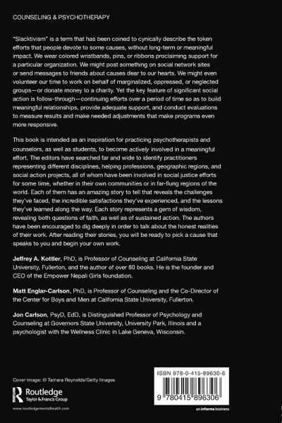 "Slacktivism" is a term that has been coined to cynically describe the token efforts that people devote to some cause, without long-term or meaningful impact. We wear colored wristbands, pins, or ribbons proclaiming support for a particular organization. We might post something on social network sites or send messages to friends about causes dear to our hearts. We might even volunteer our time to work on behalf of marginalized, oppressed, or neglected groups-or donate money to a charity. Yet the key feature of significant social action is follow through-continuing efforts over a period of time so as to build meaningful relationships, provide adequate support, and conduct evaluations to measure results and make needed adjustments that make programs even more responsive. This book is intended as an inspiration for practicing psychotherapists and counselors, as well as students, to become actively involved in a meaningful effort. The authors have searched far and wide to identify practitioners representing different disciplines, helping professions, geographic regions, and social action projects, all of whom have been involved in social justice efforts for some time, whether in their own communities or in far-flung regions of the world. Each of them has an amazing story to tell that reveals the challenges they've faced, the incredible satisfactions they've experienced, and what lessons they've learned along the way. Each story represents a gem of wisdom, revealing both questions of faith, as well as of sustained action. The authors have been encouraged to dig deeply in order to talk about the honest realities of their work. After reading their stories, you will be ready to pick a cause that speaks to you and begin your own work.