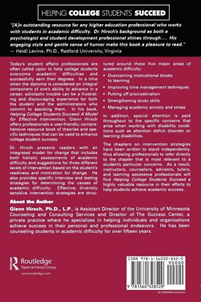 Glenn Hirsch offers professionals a user-friendly, comprehensive resource book of theories and specific techniques that can be used to enhance college student success. Dr. Hirsch offers readers an integrated model for change that includes both holistic assessments of academic difficulty and suggestions for three different levels of intervention based on the student's readiness and motivation for change. He also provides specific interview and testing strategies for determining the causes of academic difficulty.