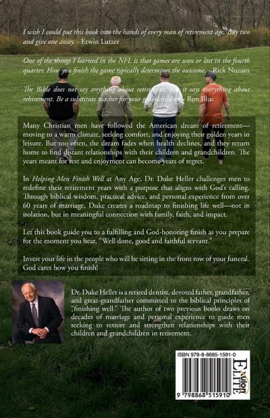 I wish I could put this book into the hands of every man of retirement age. Buy two and give one away. - Erwin Lutzer One of the things I learned in the NFL is that games are won or lost in the fourth quarter. How you finish the game typically determines the outcome. - Rick Nuzum The Bible does not say anything about retirement, but it says everything about rehirement. Be a substitute teacher for your grandchildren - Ron Blue Many Christian men have followed the American dream of retirement-moving to a warm climate, seeking comfort, and enjoying their golden years in leisure. But too often, the dream fades when health declines, and they return home to find distant relationships with their children and grandchildren. The years meant for rest and enjoyment can become years of regret. In Helping Men Finish Well at Any Age, Dr. Duke Heller challenges men to redefine their retirement years with a purpose that aligns with God's calling. Through biblical wisdom, practical advice, and personal experience from over 60 years of marriage, Duke creates a roadmap to finishing life well-not in isolation, but in meaningful connection with family, faith, and impact. Let this book guide you to a fulfilling and God-honoring finish as you prepare for the moment you hear, "Well done, good and faithful servant." Invest your life in the people who will be sitting in the front row of your funeral. God cares how you finish! Dr. Duke Heller is a retired dentist, devoted father, grandfather, and great-grandfather committed to the biblical principles of "finishing well." The author of two previous books draws on decades of marriage and personal experience to guide men seeking to restore and strengthen relationships with their children and grandchildren in retirement.