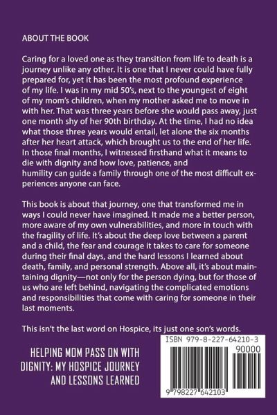 Introduction Caring for a loved one as they transition from life to death is a journey unlike any other. It is one that I never could have fully prepared for, yet it has been the most profound experience of my life. I was in my mid 50's, next to the youngest of eight of my mom's children, when my mother asked me to move in with her. That was three years before she would pass away, just one month shy of her 90th birthday. The Unknown At the time, I had no idea what those three years would entail, let alone the six months after her heart attack, which brought us to the end of her life. In those final months, I witnessed firsthand what it means to die with dignity and how love, patience, and humility can guide a family through one of the most difficult experiences anyone can face. This book is about that journey, one that transformed me in ways I could never have imagined. It made me a better person, more aware of my own vulnerabilities, and more in touch with the fragility of life. It's about the deep love between a parent and a child, the fear and courage it takes to care for someone during their final days, and the hard lessons I learned about death, family, and personal strength. Above all, it's about maintaining dignity-not only for the person dying, but for those of us who are left behind, navigating the complicated emotions and responsibilities that come with caring for someone in their last moments. It was met with resistance from our family, many of whom were not ready to accept what Hospice represented: that the end was near. But for me, it was the beginning of a process that would help me come to terms with her eventual passing and prepare myself for the challenges ahead. Having Hospice come into our lives was a blessing. The care they provided, both for my mother and for me, was invaluable. Our Hospice nurse was nothing short of an angel, offering guidance, comfort, and expertise that allowed me to focus on being my mother's son rather than just her caregiver. But it wasn't always easy. There were moments of doubt, when I questioned whether I was strong enough for the task. There were moments of conflict, particularly when it came to setting boundaries with family members who wanted to visit during my mother's rest periods, which were so crucial to her comfort. In these moments, I had to learn to take the reins, to advocate for her needs, and to make decisions I never imagined I'd have to make. Maintaining her dignity was one of the most important things I could do for her, and Hospice played a key role in making that possible. They provided assistance with everything from bathing to managing her personal needs, allowing me to step into the role of caregiver without taking away her sense of self and dignity. It was a delicate balance-one that required me to become the parental figure in many ways, but without stripping her of her identity as my mother. This, too, was a profound lesson in love and respect. Reflection Now that mom's gone, I find myself reflecting on those final weeks, replaying moments in my mind and wondering if I did enough. I wish I'd spent more time sitting on the porch with her, talking about life, sharing memories. I wish I'd been more present during that last month, when time felt both endless and fleeting. This book is a reflection of my journey, and the lessons I learned along the way. It's not just about death-it's about love, family, and the strength we find in ourselves when we're faced with the hardest challenges of our lives. I hope that by sharing my story, others who are walking this path will find comfort, guidance, and a sense of peace as they help their own loved ones die with dignity.