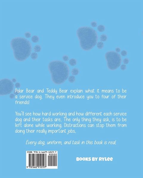 Polar Bear and Teddy Bear explain what it means to be a service dog. They even introduce you to four of their friends! You'll see how hard working and how different each service dog and their tasks are. The Helping Paws Pack will show you why it is so important to be left alone while working. Distractions can stop them from doing their really important jobs. This book is a perfect educational tool! Comprehension level: Kindergarten Level Language Picture Book It can be used for all ages It is applicable to the laws in the US, UK, and Canada Shows diversity of service dog breed, tasks, gear, and work locations It has female, male, and non-binary language gendered language Join the Helping Paws Pack as they raise awareness and educate others on service dogs. Every dog, uniform, and task in this book is real! You can even meet them at the back of the book!¿