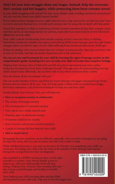 Don't let your teen struggle alone any longer. Instead, help them overcome their anxiety and feel happier, while protecting them from extreme stress! Is your child struggling with school? Do they seem distant while avoiding emotional connections? Are you worried about your child's mental health? If you notice sudden changes in your child's behavior, it can be a big concern for you. But you don't have to worry-you can help your anxious teen by using this in-depth self-help guide. One in five teenagers is likely to experience chronic anxiety sometime during their younger years. And this can be an alarming statistic for parents, especially if you have noticed recent behavioral differences in your child. Your child could be withdrawing from friends, staying in their room too often, or finding themselves constantly irritable and angry at everything. While every teenager goes through similar changes, these can also be signs of your child suffering from emotional and mental challenges. If they are dealing with internal stress that isn't evident to everyone else, they may not know who to turn to for help, and this can lead to depression if it is left untreated. You can act now and be present for your child by learning the signs of teenage anxiety in this comprehensive guide, including how you can help your child overcome these negative feelings. Helping Your Anxious Teen is filled with real-life situations and experiences pulled from author Katherine Guzman's own challenges. Through years of understanding how her child's mind works differently, she has been able to help them overcome their anxiety. Now, she shares all her knowledge with you! You can avoid mistakes without searching for hours through web pages and psychology books, because she has done it all for you. This self-help guide is filled with researched knowledge, first-hand experience, and practical techniques to help you and your child. Inside Helping Your Anxious Teen, you will discover: * How to recognize anxiety in adolescents * The causes of teenager anxiety * The consequences of untreated anxiety * Your role in your child's mental state * Warning signs of adolescent anxiety * Treatment solutions for anxiety * How to notice and prevent suicidal teenagers * A guide to finding the best help for your child * And so much more! Navigating this new situation can be difficult, especially when you feel as though you are going through this alone. But you are not alone-and this book is here to help. While childhood anxiety is a real fear for parents, it is something your child can overcome. Providing your child with the tools to be mindful of their feelings and express themselves is important for their development. Also included is a bonus section on how to look after yourself as a parent. Your mental health is just as important, and your child usually feeds off your energy. Helping Your Anxious Teen contains self-care tips to keep yourself happy and healthy to benefit your child. Start helping your child navigate their anxiety-filled developmental years with e