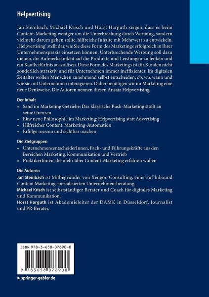 Jan Steinbach, Michael Krisch und Horst Harguth zeigen, dass es beim Content-Marketing weniger um die Unterbrechung durch Werbung, sondern vielmehr darum gehen sollte, hilfreiche Inhalte mit Mehrwert zu entwickeln. 'Helpvertising' stellt dar, wie Sie diese Form des Marketings erfolgreich in Ihrer Unternehmenspraxis einsetzen können. Unterbrechende Werbung soll dazu dienen, die Aufmerksamkeit auf die Produkte und Leistungen zu lenken und ein Kaufbedürfnis auszulösen. Diese Form des Marketings ist für Kunden nicht sonderlich attraktiv und für Unternehmen immer ineffizienter. Im digitalen Zeitalter wollen Menschen zunehmend selbst entscheiden, ob, wo, wann und wie sie mit Unternehmen interagieren. Daher benötigen wir im Marketing eine neue Denkweise. Die Autoren nennen diesen Ansatz Helpvertising.
