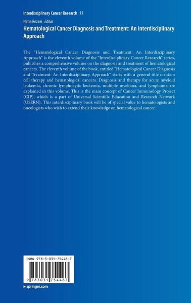 The "Hematological Cancer Diagnosis and Treatment: An Interdisciplinary Approach" is the eleventh volume of the "Interdisciplinary Cancer Research" series, publishes a comprehensive volume on the diagnosis and treatment of hematological cancers. The eleventh volume of the book, entitled "Hematological Cancer Diagnosis and Treatment: An Interdisciplinary Approach" starts with a general title on stem cell therapy and hematological cancers. Diagnosis and therapy for acute myeloid leukemia, chronic lymphocytic leukemia, multiple myeloma, and lymphoma are explained in this volume. This is the main concept of Cancer Immunology Project (CIP), which is a part of Universal Scientific Education and Research Network (USERN). This interdisciplinary book will be of special value to hematologists and oncologists who wish to extend their knowledge on hematological cancer.