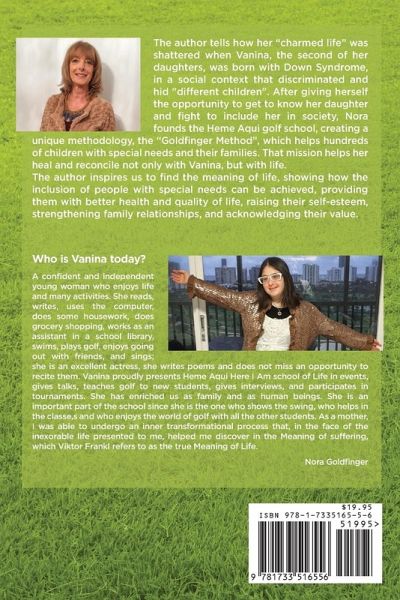 Heme Aquí, Here I Am: My Reconciliation with Life. The author tells how her "charmed life" was shattered when Vanina, the second of her daughters, was born with Down Syndrome, in a social context that discriminated and hid "different children". After giving herself the opportunity to get to know her daughter and fight to include her in society, Nora founds the Heme Aqui golf school, creating a unique methodology, the "Goldfinger Method", which helps hundreds of children with special needs and their families. That mission helps her heal and reconcile not only with Vanina, but with life. The author inspires us to find the meaning of life, showing how the inclusion of people with special needs can be achieved, providing them with better health and quality of life, raising their self-esteem, strengthening family relationships, and acknowledging their value.