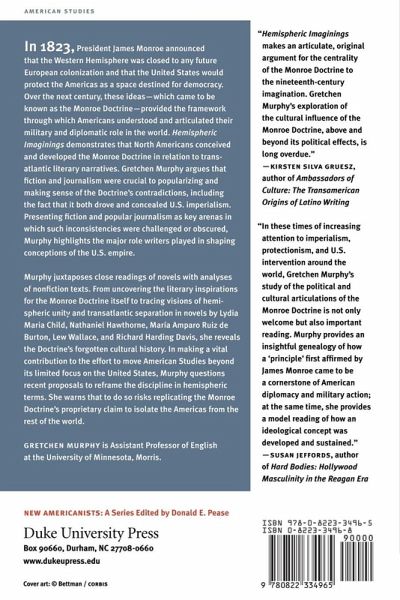 In 1823, President James Monroe announced that the Western Hemisphere was closed to any future European colonization and that the United States would protect the Americas as a space destined for democracy. Over the next century, these ideas-which came to be known as the Monroe Doctrine-provided the framework through which Americans understood and articulated their military and diplomatic role in the world. Hemispheric Imaginings demonstrates that North Americans conceived and developed the Monroe Doctrine in relation to transatlantic literary narratives. Gretchen Murphy argues that fiction and journalism were crucial to popularizing and making sense of the Doctrine's contradictions, including the fact that it both drove and concealed U.S. imperialism. Presenting fiction and popular journalism as key arenas in which such inconsistencies were challenged or obscured, Murphy highlights the major role writers played in shaping conceptions of the U.S. empire. Murphy juxtaposes close readings of novels with analyses of nonfiction texts. From uncovering the literary inspirations for the Monroe Doctrine itself to tracing visions of hemispheric unity and transatlantic separation in novels by Lydia Maria Child, Nathaniel Hawthorne, María Amparo Ruiz de Burton, Lew Wallace, and Richard Harding Davis, she reveals the Doctrine's forgotten cultural history. In making a vital contribution to the effort to move American Studies beyond its limited focus on the United States, Murphy questions recent proposals to reframe the discipline in hemispheric terms. She warns that to do so risks replicating the Monroe Doctrine's proprietary claim to isolate the Americas from the rest of the world.