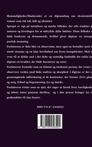 En digtsamling om eksistentielle temaer som tid, tab, håb og identitet. Sproget er rigt på metaforer og stærke billeder, der ofte trækker på naturen og hverdagen for at udtrykke dybe følelser. Disse billeder er både konkrete og drømmende, hvilket giver digtene en særegen poetisk stemning. I digtene er der en gennemgående udforskning af de kontraster, der former livet: glæde og sorg, frihed og begrænsning, lys og mørke. Digtene reflekterer over livets flygtighed og de øjeblikke, der definerer os som mennesker. Tab , hvad enten det er kærlighed, en kær relation eller endda sig selv, synes at…mehr