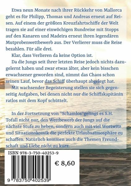 Etwa neun Monate nach ihrer Rückkehr von Mallorca geht es für Philipp, Thomas und Andreas erneut auf Reisen. Auf einem der größten Kreuzfahrtschiffe der Welt tragen sie auf einer einwöchigen Rundreise mit Stopps auf den Kanaren und Madeira erneut ihren legendären Wettbewerb aus. Der Verlierer muss den Urlaub bezahlen. Für alle drei.Klar, dass Verlieren da keine Option ist.Da die Jungs seit ihrer letzten Reise jedoch nichts dazugelernt haben und zwar älter, aber kein bisschen erwachsener geworden sind, nimmt das Chaos schon seinen Lauf, bevor das Schiff überhaupt abgelegt hat.Mit wachsender Begeisterung stellen sie sich Aufgaben, bei denen nicht nur die Schiffskapitänin ratlos mit dem Kopf schüttelt.In der Fortsetzung von "Schamlos" gelingt es S.H. Tofall nicht nur, den Wettbewerb der Jungs auf die nächste Stufe zu heben, sondern auch mit viel Wortwitz und Situationskomik die perfekte Urlaubsatmosphäre zu schaffen. Natürlich kommen auch die Themen Freundschaft und Liebe nicht zu kurz.