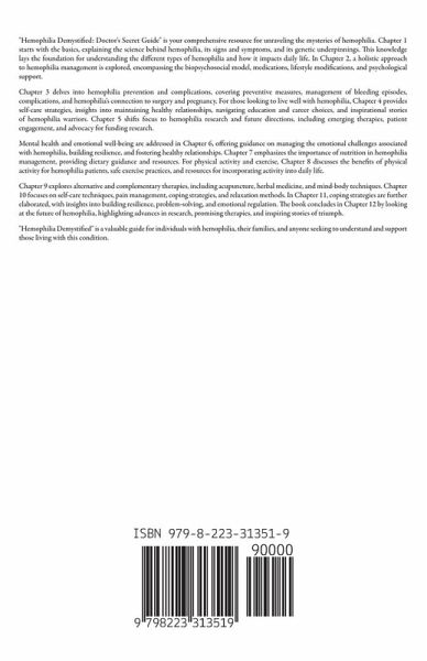 "Hemophilia Demystified: Doctor's Secret Guide" is your comprehensive resource for unraveling the mysteries of hemophilia. Chapter 1 starts with the basics, explaining the science behind hemophilia, its signs and symptoms, and its genetic underpinnings. This knowledge lays the foundation for understanding the different types of hemophilia and how it impacts daily life. In Chapter 2, a holistic approach to hemophilia management is explored, encompassing the biopsychosocial model, medications, lifestyle modifications, and psychological support. Chapter 3 delves into hemophilia prevention and complications, covering preventive measures, management of bleeding episodes, complications, and hemophilia's connection to surgery and pregnancy. For those looking to live well with hemophilia, Chapter 4 provides self-care strategies, insights into maintaining healthy relationships, navigating education and career choices, and inspirational stories of hemophilia warriors. Chapter 5 shifts focus to hemophilia research and future directions, including emerging therapies, patient engagement, and advocacy for funding research. Mental health and emotional well-being are addressed in Chapter 6, offering guidance on managing the emotional challenges associated with hemophilia, building resilience, and fostering healthy relationships. Chapter 7 emphasizes the importance of nutrition in hemophilia management, providing dietary guidance and resources. For physical activity and exercise, Chapter 8 discusses the benefits of physical activity for hemophilia patients, safe exercise practices, and resources for incorporating activity into daily life. Chapter 9 explores alternative and complementary therapies, including acupuncture, herbal medicine, and mind-body techniques. Chapter 10 focuses on self-care techniques, pain management, coping strategies, and relaxation methods. In Chapter 11, coping strategies are further elaborated, with insights into building resilience, problem-solving, and emotional regulation. The book concludes in Chapter 12 by looking at the future of hemophilia, highlighting advances in research, promising therapies, and inspiring stories of triumph. "Hemophilia Demystified" is a valuable guide for individuals with hemophilia, their families, and anyone seeking to understand and support those living with this condition.
